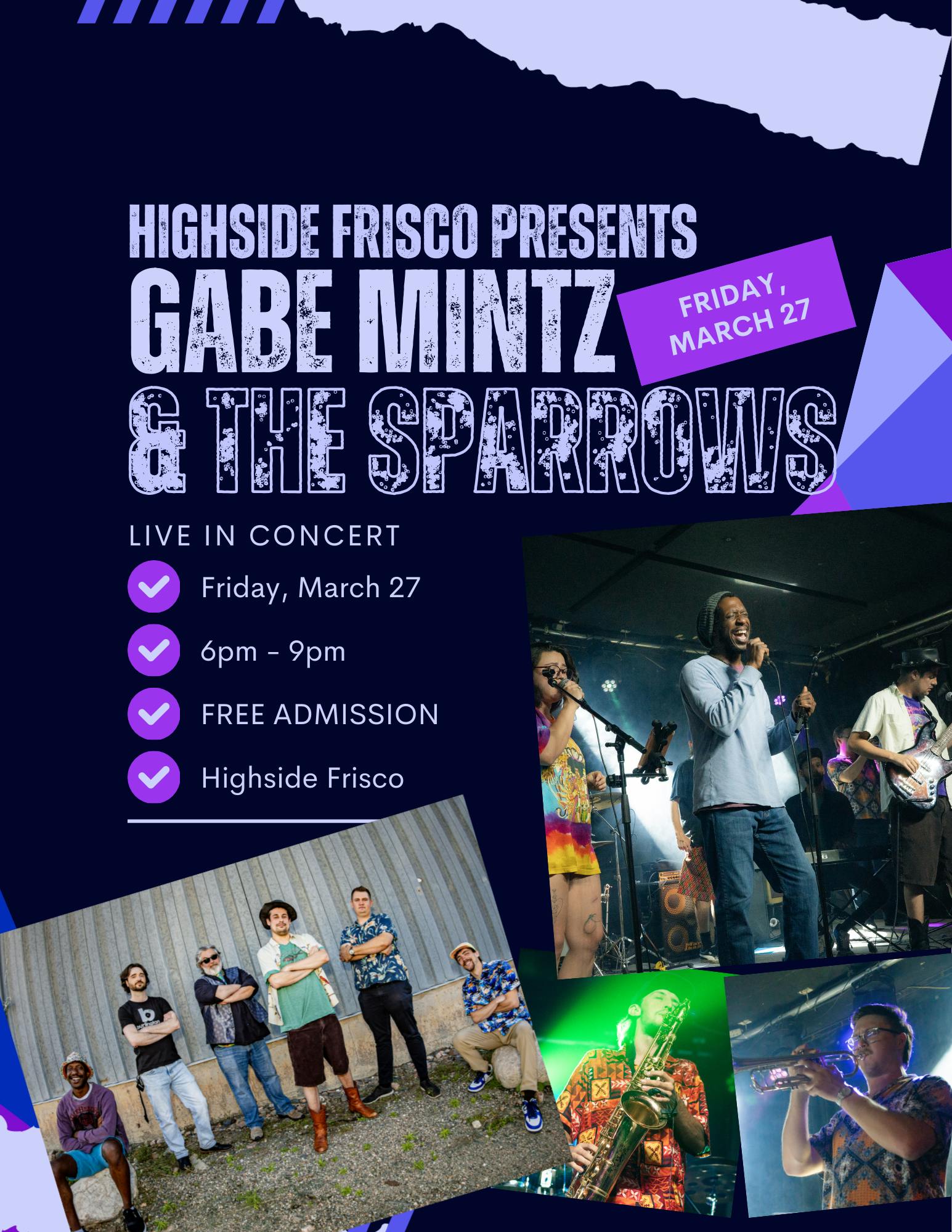 Local music scene staple Gabe Mintz is bringing his Sparrows back to Highside Frisco for some groovinβ, movinβ, shakinβ and bakinβ Friday, March 27th!