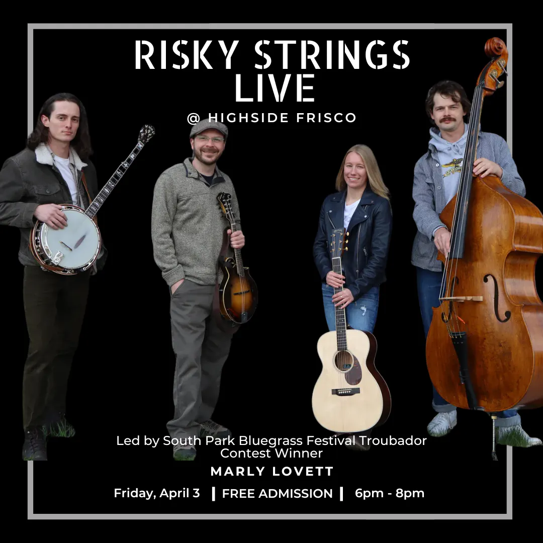 @riskystrings is taking the Highside Frisco stage Friday, April 3rd, for some mind-bending arrangements and blend traditional bluegrass with new school vibesβ¦